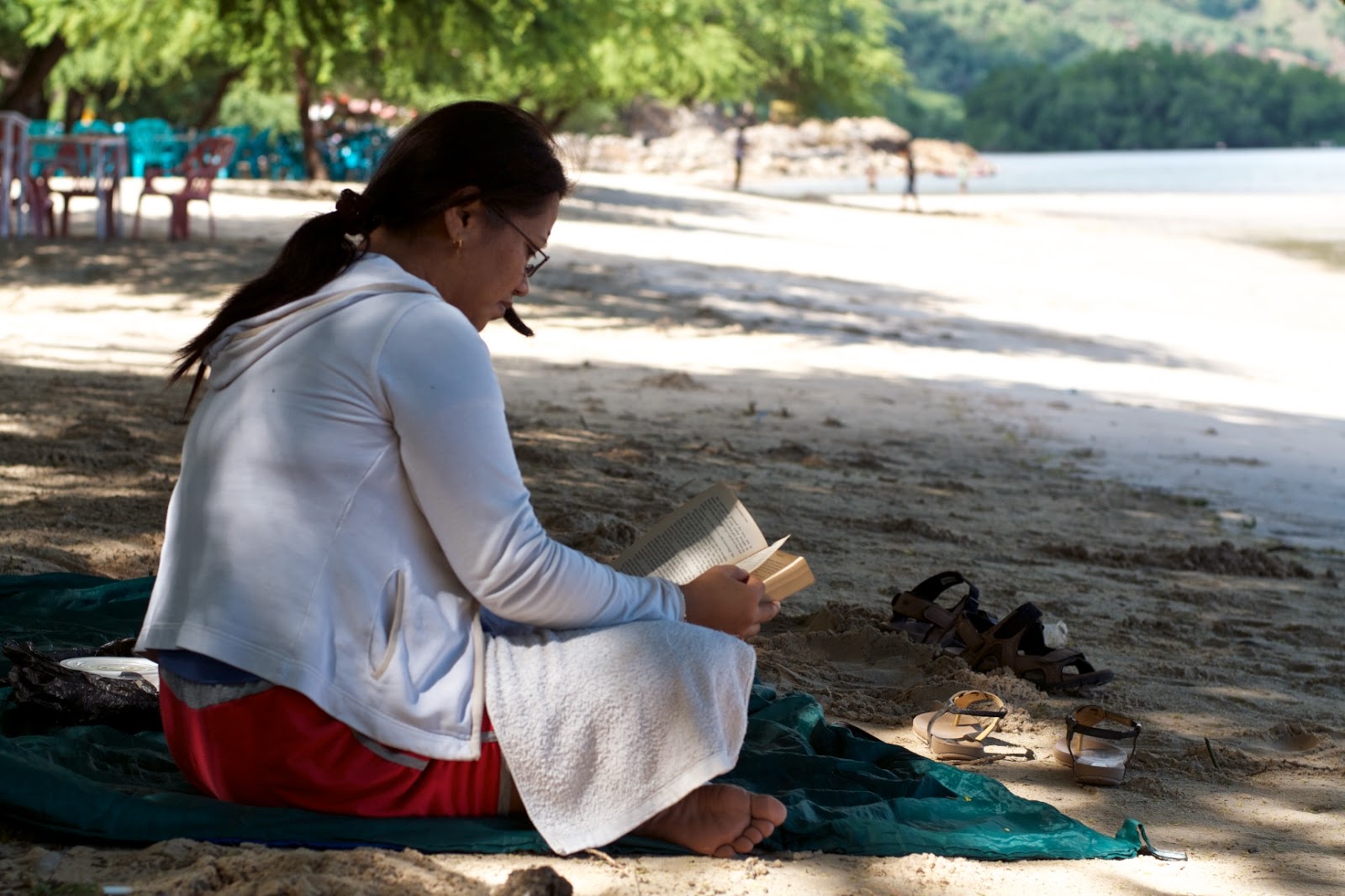 Os livros são viagem. Os livros são conhecimento. Os livros são entretenimento. Poderia continuar a enumerar tudo aquilo que os livros são para os muitos leitores com quem já conversei. Mas para a Elizabeth o livro é aquilo que talvez mais me toque: o legado de alguém que amávamos e que já partiu. O livro é memória. O livro é prolongamento. No dia em que a conheci, a Elizabeth tinha começado a ler "Divine Guidance" de Swami Govinda, um título que o seu melhor amigo muito lhe tinha recomendado. Nesse mesmo dia assinalavam-se os três meses da morte súbita desse seu melhor amigo. "Está a ajudar-me a reconectar-me com o meu caminho espiritual. Leio-o por mim, mas também por ele. Antes de morrer, deixou-me quatro livros. Este é o último". A Elizabeth, que é australiana, mudou-se este ano para Timor-Leste e está a dar aulas em Dili. Levou consigo a filha adolescente. Tem pela frente um contrato de dois anos para cumprir, pelo que contam ficar no país pelo menos esse tempo. Ambas estão a gostar muito de lá viver. A Leilani também lia, mas admitiu que não o faz com muita frequência. "Estou a tentar ler mais", disse-me. "Por isso passei pela biblioteca da escola e achei que "Eat, Pray and Love" seria interessante". Fotografei-as na esplanada do Hotel Esplanada, na Avenida de Portugal, uma marginal que percorre parte da costa de Dili. Ali, sentada à sombra, fintei o sol inclemente e recebi com alívio a pouca brisa que soprava do mar à minha frente. Almocei, bebi o melhor sumo de lima que alguma vez provei e relaxei ao som de uma boa música enquanto acedia à net, principal razão que me levou a lá ir. Um dia que visitem Timor-Leste não deixem de passar por lá, nem que seja para tomar um delicioso café timorense.